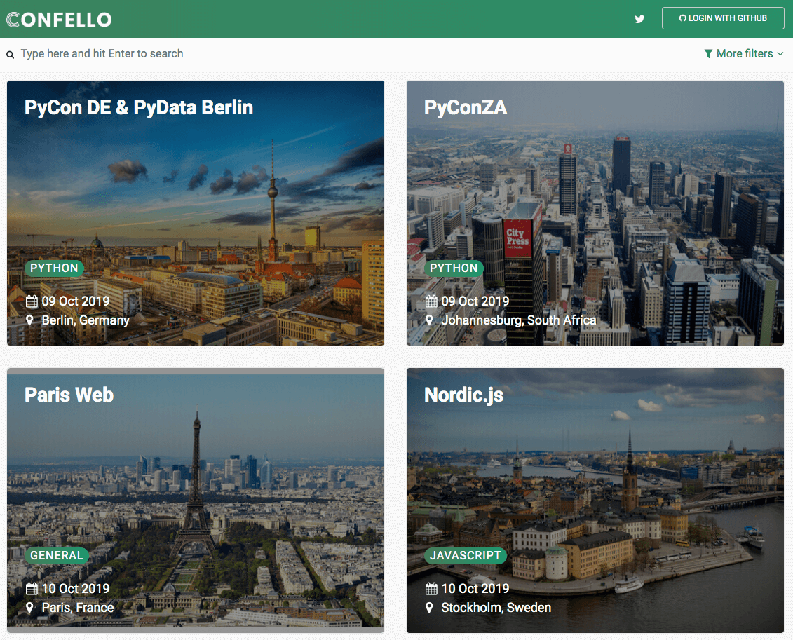 In the last few months I spent some of my free time working on a project I felt was missing in the tech space. I'm proud to announce that today we're making Confello, a tech conference aggregator website, available to the public. Find, browse and discuss your favorite tech conferences at Confello!